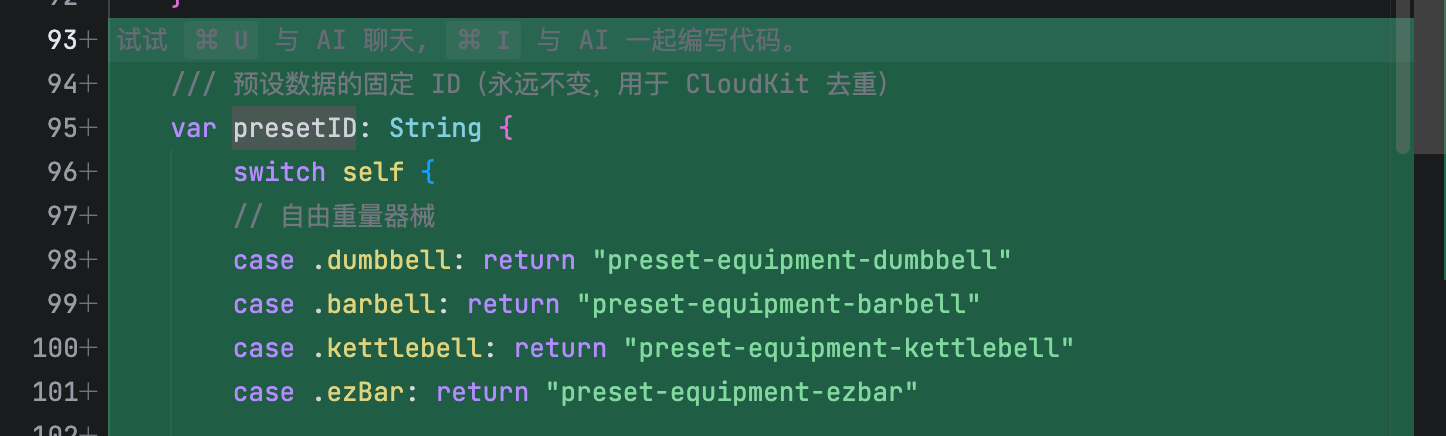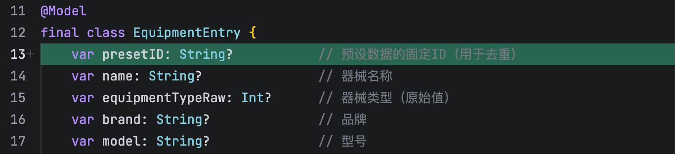 - 在 SwiftData 模型中,添加可选的 presetID 参数。在枚举中也添加 presetID 属性。如果 presetID 不为 nil,表示是预设数据。