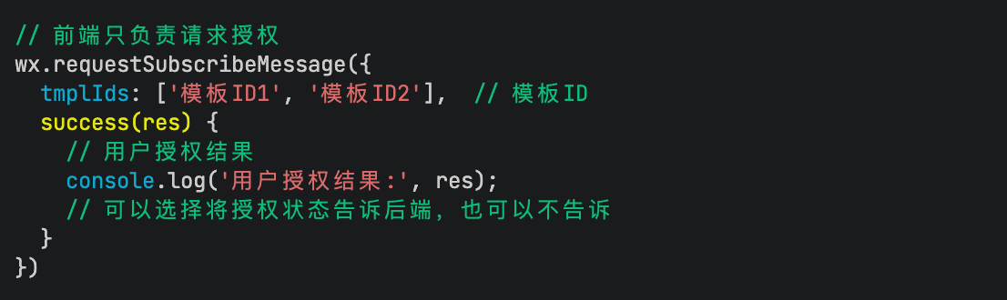 前端只需要在合适的时机调用 wx.requestSubscribeMessage